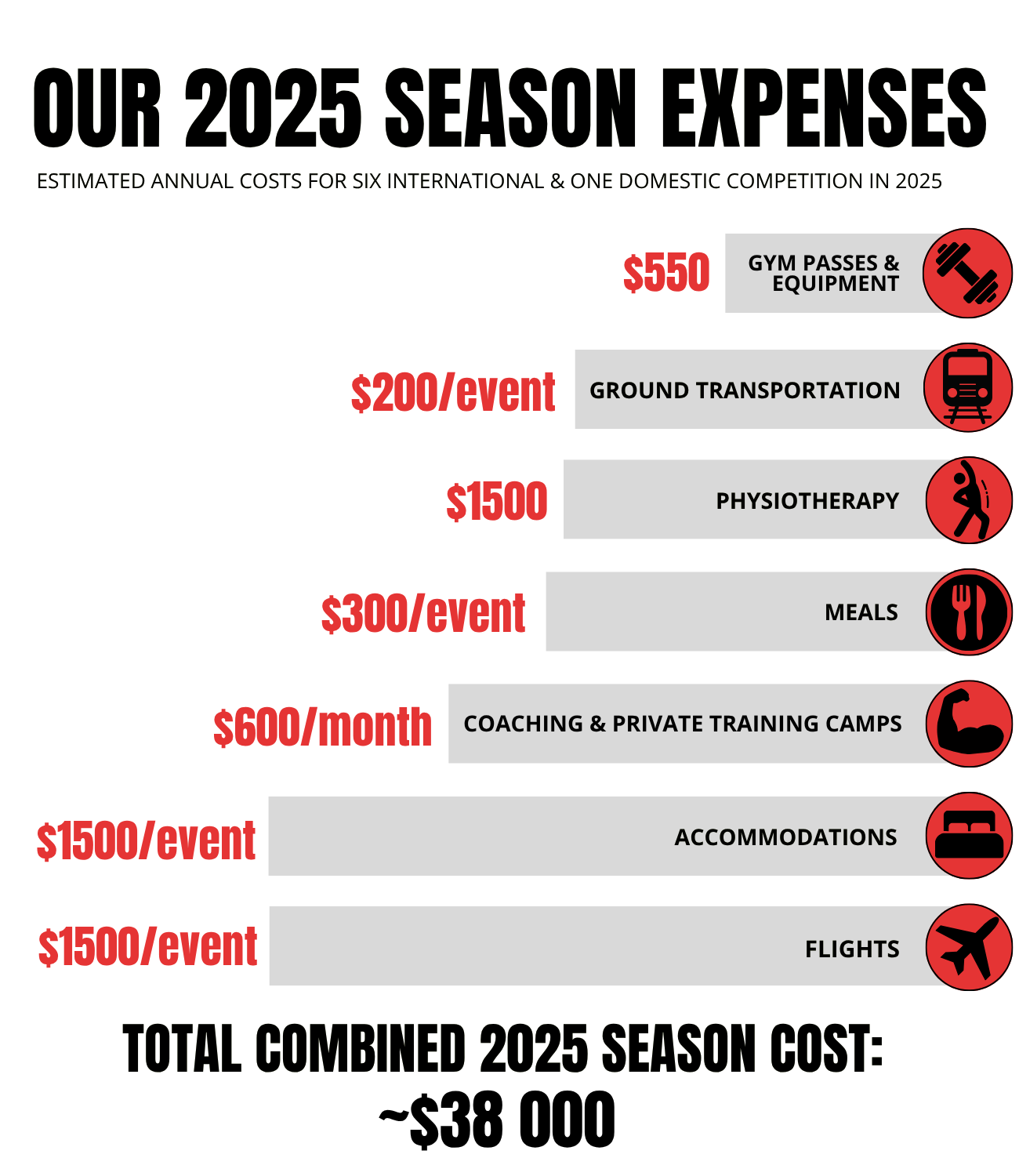 Competing at the highest level of sport climbing requires year-round training, travel, and dedication. For us, representing Canada on the international stage is entirely self-funded - there’s currently no national support for athletes in climbing. Every flight, train, and hotel we purchase is for World Cups is paid for out of pocket.