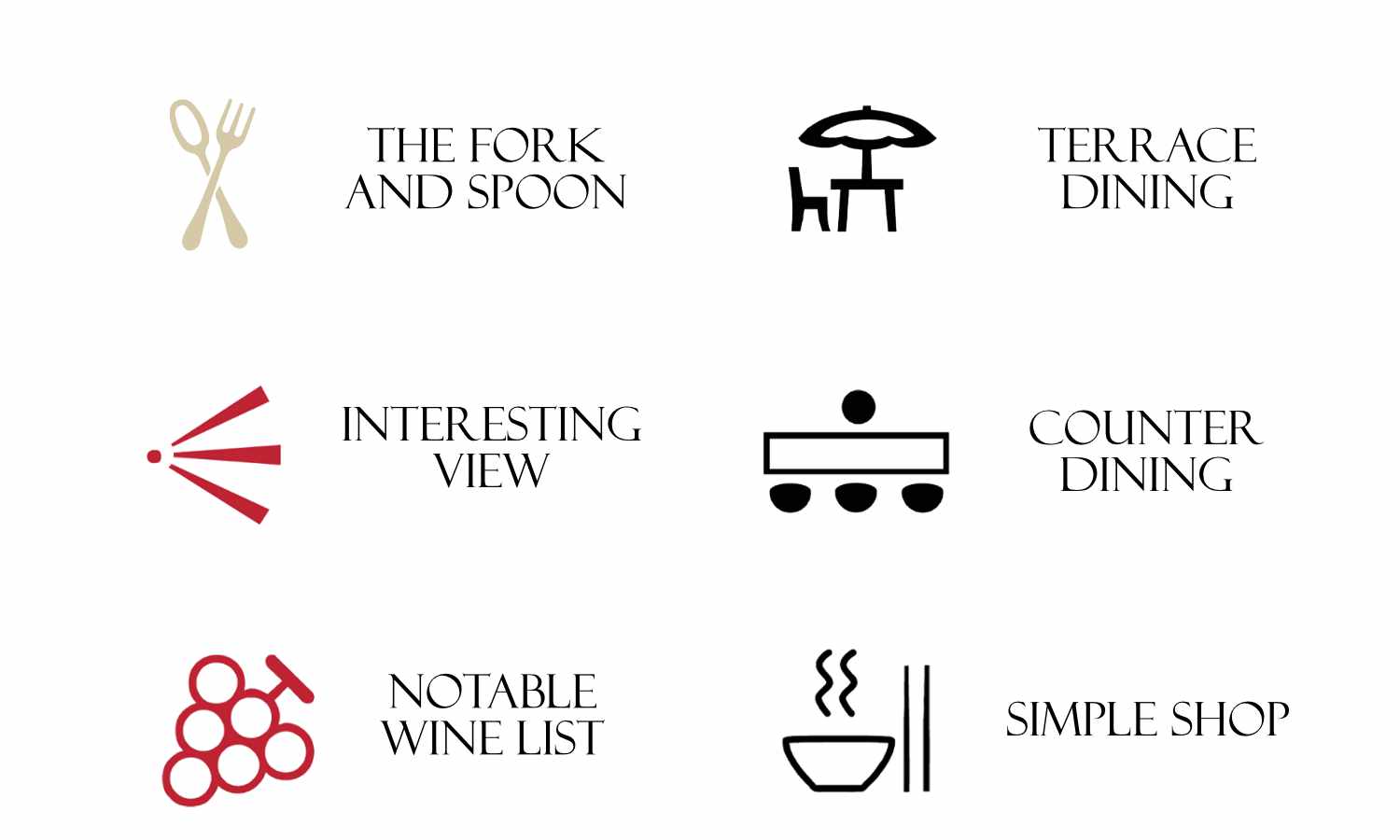 Other symbols recognize the wine list, the view, or whether there is a terrace, a counter, or a simple design.