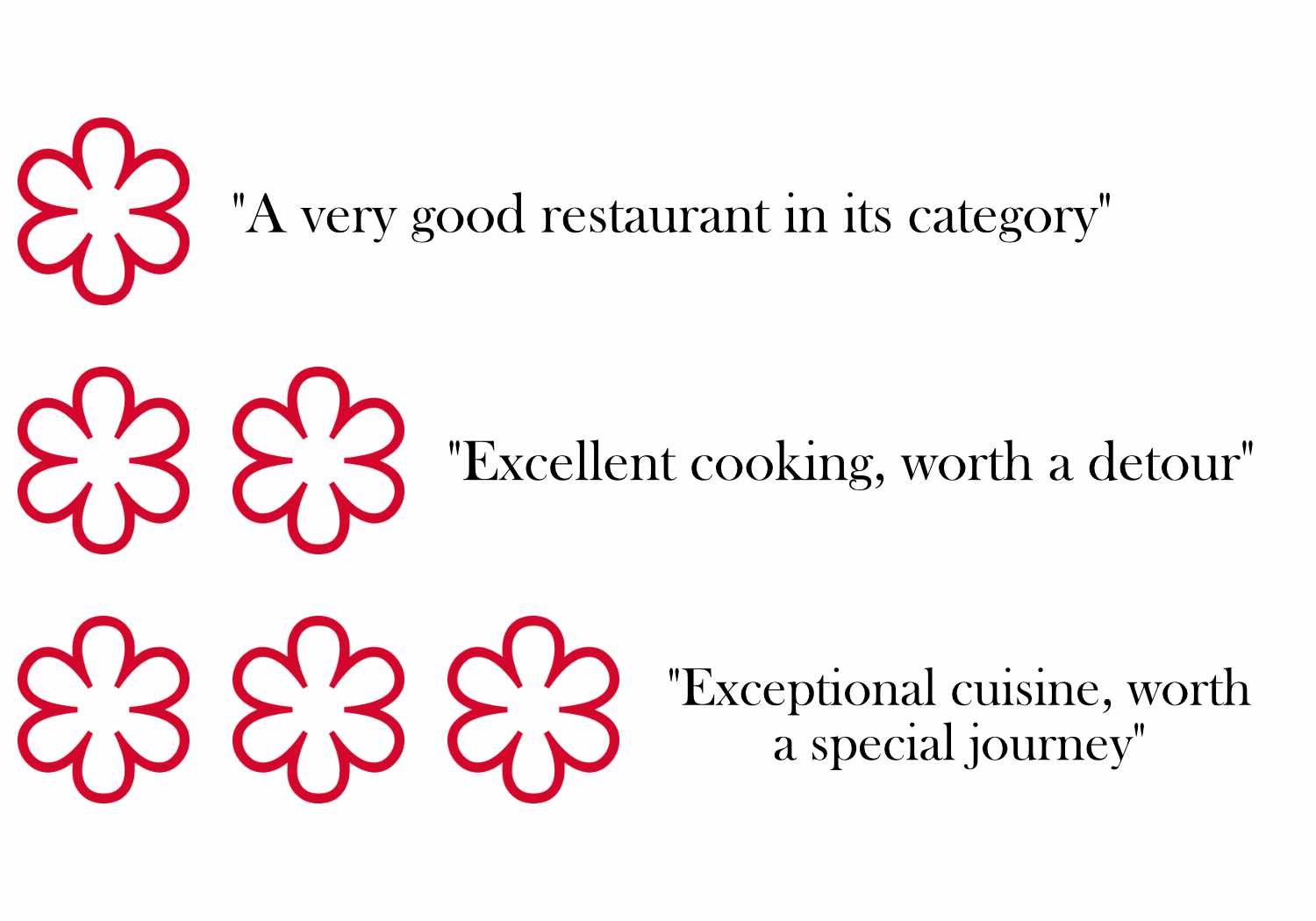 In 1926, they introduced stars. High-quality restaurants would receive a single star, like a pass or fail. Five years later, they developed the three-star rating system, where a restaurant could earn anywhere from zero to three stars: